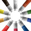 The package includes the following shades: Chrome Yellow Hue, Lemon Yellow Hue, Cadmium Red Hue, Permanent Alizarin Crimson, French Ultramarine, Prussian Blue, Yellow Ochre, Burnt Sienna, Titanium White & Lamp Black.